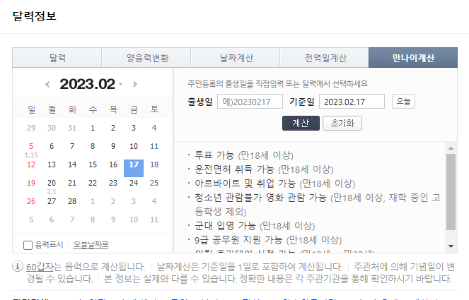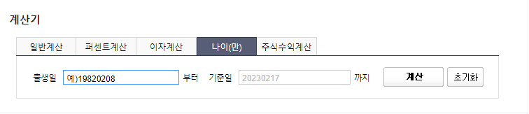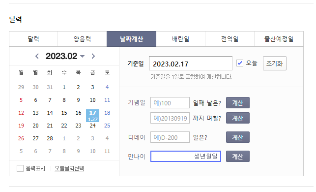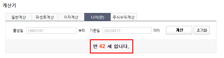 1번에서 확인한 다음 포털의 만나이 계산기와 같이 달력정보에 포함되어 있는 기능이기도 합니다. 출생일 / 기준일을 입력한 후 [계산]버튼을 선택하면 만나이를 확인할 수 있습니다. 마찬가지로 1980년 11월 01일 생을 예시로 만나이를 계산해 봅니다.