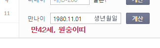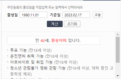 위 사진은 1980년 11월 01일생을 기준으로 만나이를 계산해본 참고 사진입니다. 만 42세, 원숭이 띠라는 정보를 얻을 수 있습니다. 또한, 투표, 운전면허 취득, 아르바이트, 영화 관람등에서 기준이 되는 만나이에 대한 정보를 비교할 수 있다는 점도 장점이 될 수 있겠네요.