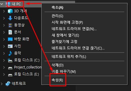 윈도우 탐새기 내PC 아이콘에서 마우스 오른쪽 버튼을 클릭합니다. '속성' 메뉴를 선택합니다. 해당 방법은 1에서 안내안 정보창과 같은 창이 뜨게 됩니다.