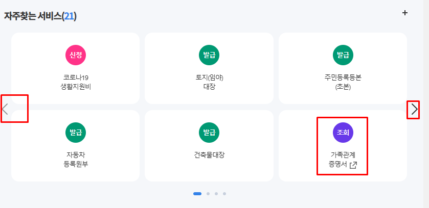 홈페이지 중간 아래 부분에는 '자주찾는 서비스'가 있습니다. 여기서 여러 사람들이 활용하는 대표적인 기능들을 빠르게 찾을 수 있습니다. 만약, 보이지 않는다면 양쪽에 있는 화살표 아이콘을 이용하여 화면을 전환해볼 수 있습니다. 그럼에도 불구하고 찾을 수 없다면 검색바를 이용하는 것을 추천합니다.