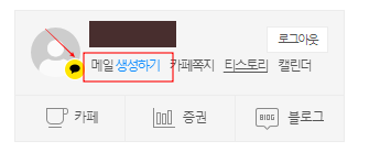 위 사진과 같이 아직 다음 메일을 생성하지 않은 카카오 계정은 [메일 생성하기]라는 표시가 뜨게 됩니다. 해당 버튼을 선택하면 다음 메일을 생성할 수 있는 페이지로 연결됩니다.