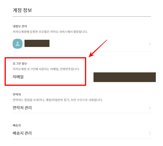 개인 프로필을 선택하면 Kakao 계정관리 페이지로 연결되게 됩니다. 여기서는 '내정보 관리', '로그인 정보(이메일)', '연락처', '배송지'에 대한 설정을 할 수 있습니다. [로그인 정보(이메일)]을 선택합니다.