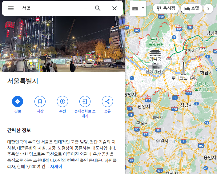 예를 들어, 서울을 검색해 봅니다. 검색한 후에는 사이드바에 지역에 관련된 정보와 함께 경로 / 저장 / 주변 / 휴대전화로 보내기 / 공유등의 기능이 포함되어 있습니다. 지도 영역에는 검색 지역이 표시됩니다.